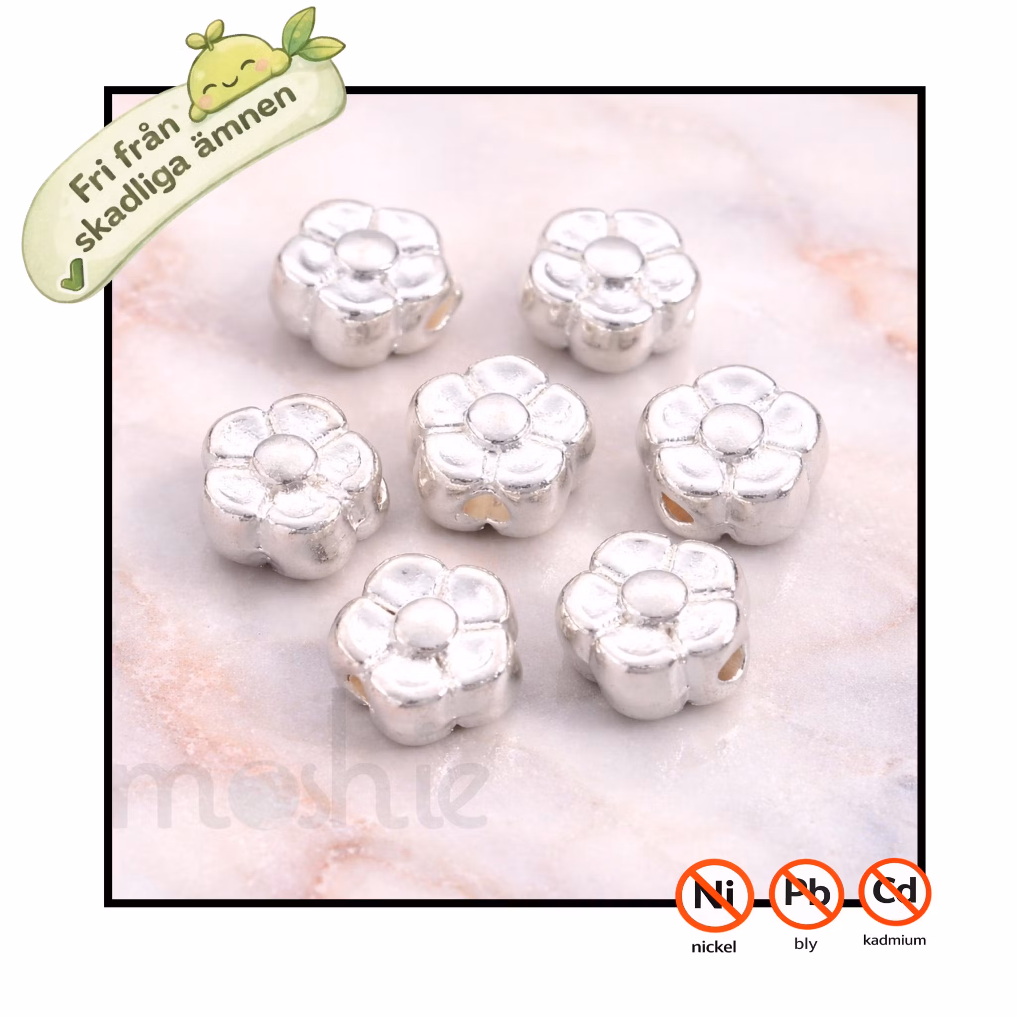 Söta små blommor i silverfärgad legering. Den nätta formen gör dem perfekta som mellanpärlor som bryter av, ramar in eller lyfter fram andra pärlor i armband och halsband.