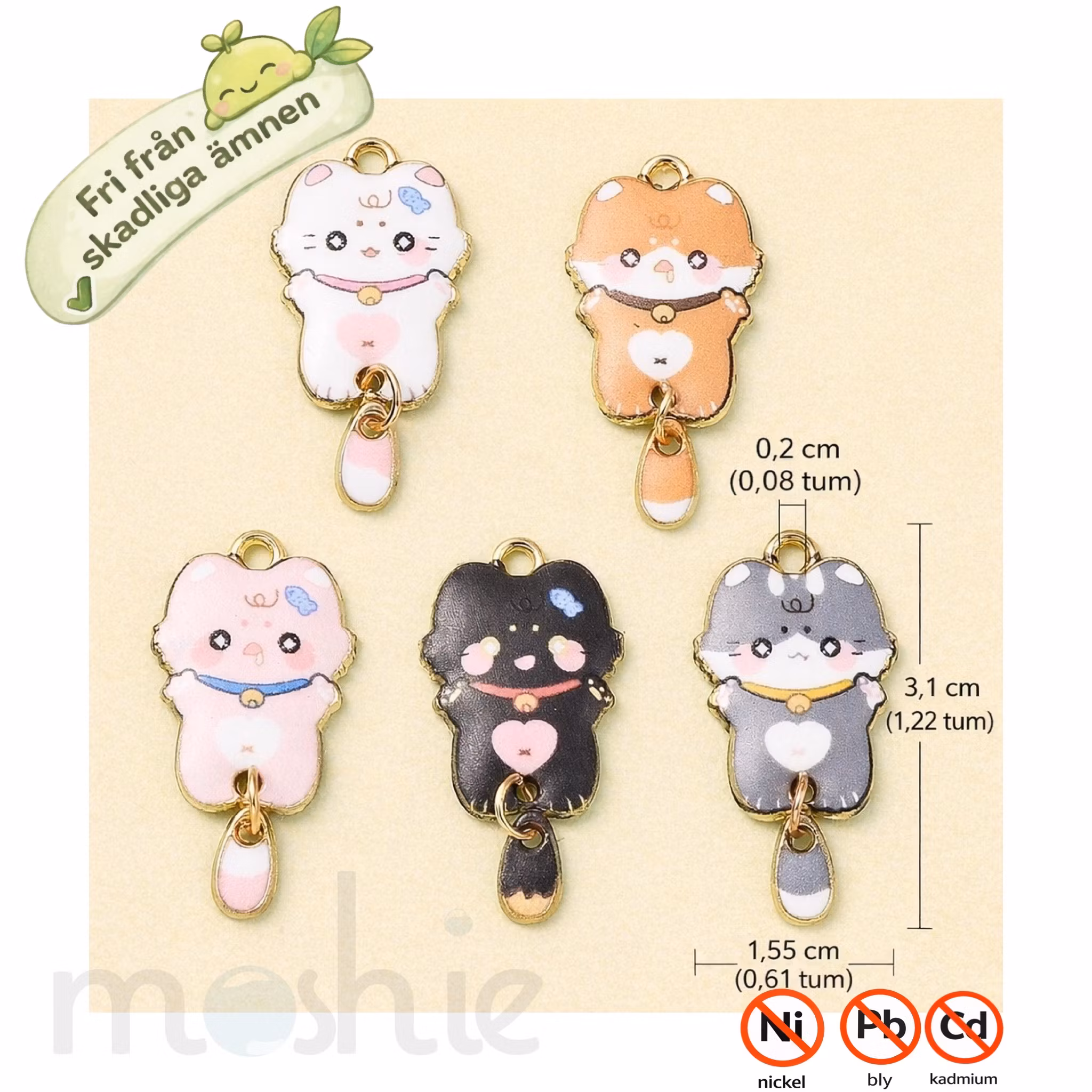 Ett oemotståndligt set med söta kattberlocker i emalj, perfekta för dig som vill skapa lekfulla och charmiga smycken. Varje katt har sin egen färg och uttryck, med guldfärgad kant och liten rörlig svans som ger extra liv åt designen. Berlockerna passar utmärkt till armband, halsband, örhängen, nyckelringar, mobilsmycken och DIY-projekt där du vill addera en mjuk, kawaii-inspirerad detalj.