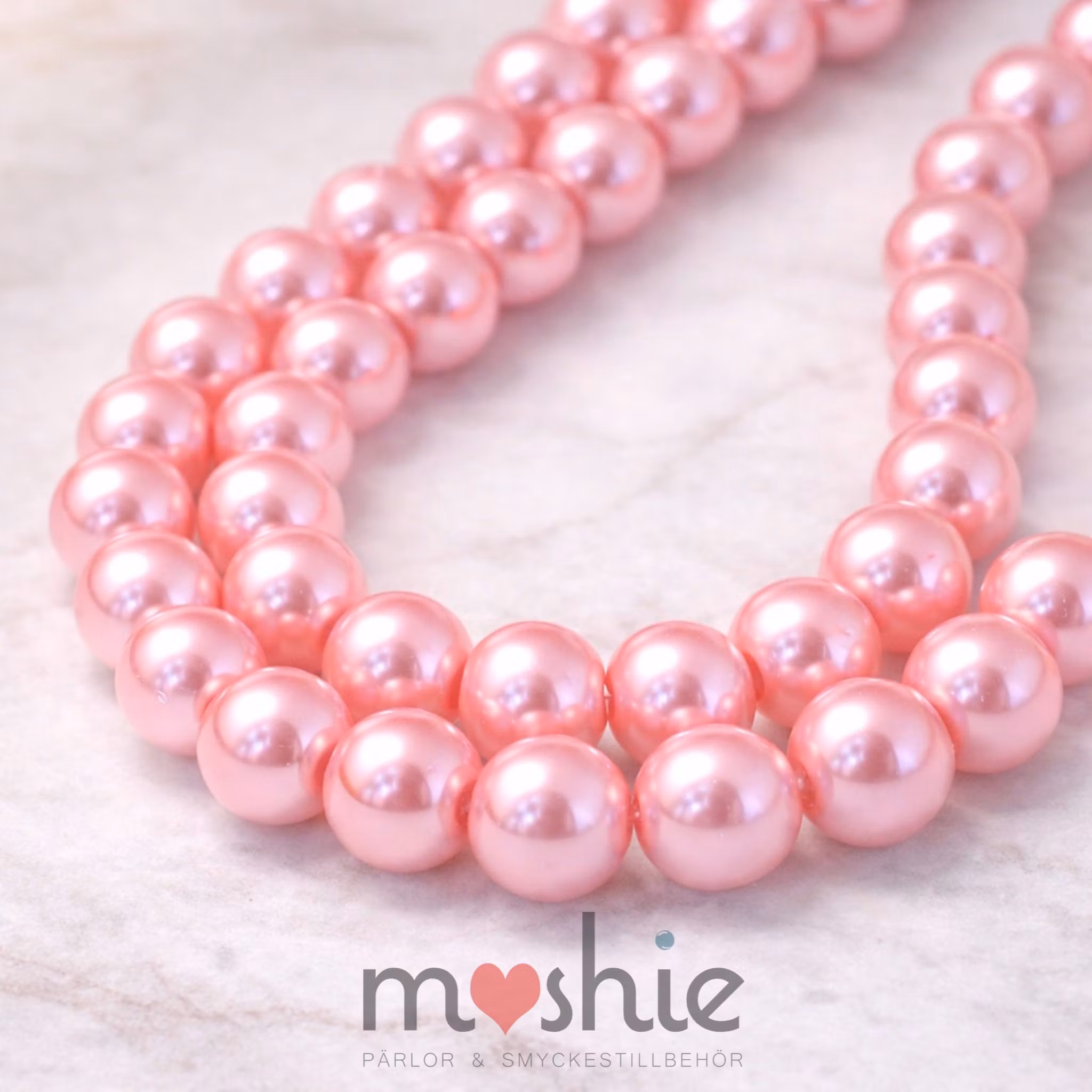 Sträng med glaspärlor ur vår serie "pärlemor". Den har fått sitt namn eftersom pärlan är färgad med ett tunt pärliserande färglager som ger pärlan dess vackra skimmer som påminner om pärlemor.