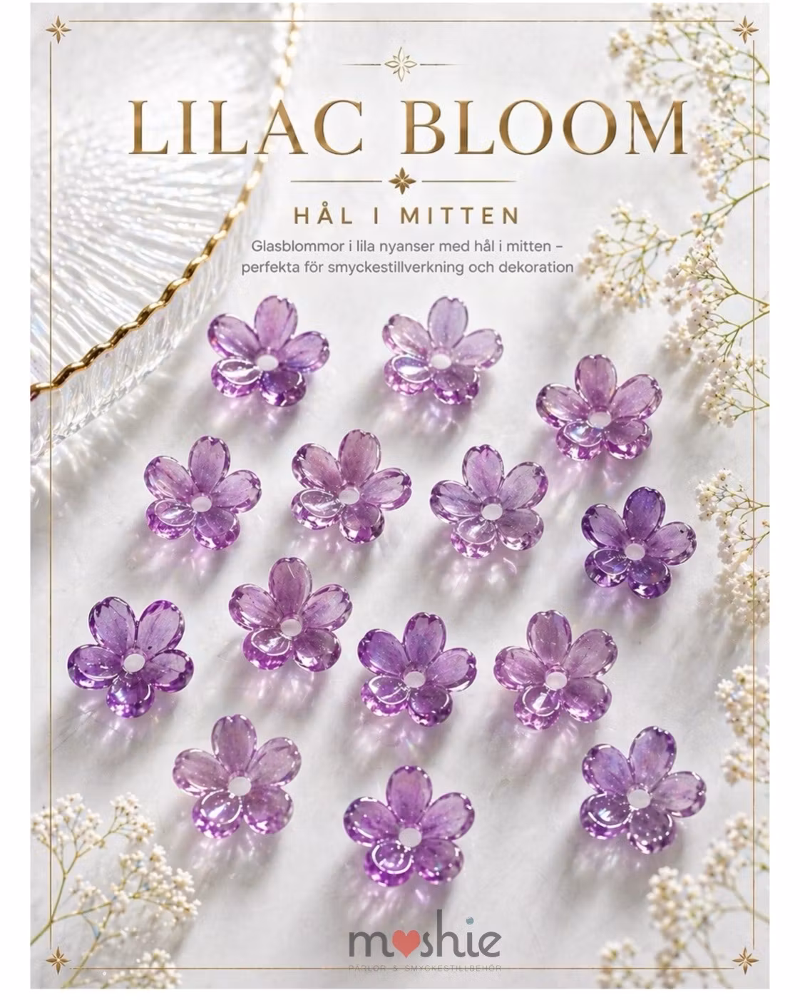 Eleganta blomformade glaspärlor i transparenta nyanser som fångar ljuset på ett mjukt och lyxigt sätt. Dom är fyllda med ett subtilt glitterpulver för extra mjukt bling bling. Perfekta som mellandelar, pärlhattar, fokusdetaljer eller dekorativa inslag i dina smycken och DIY-projekt.