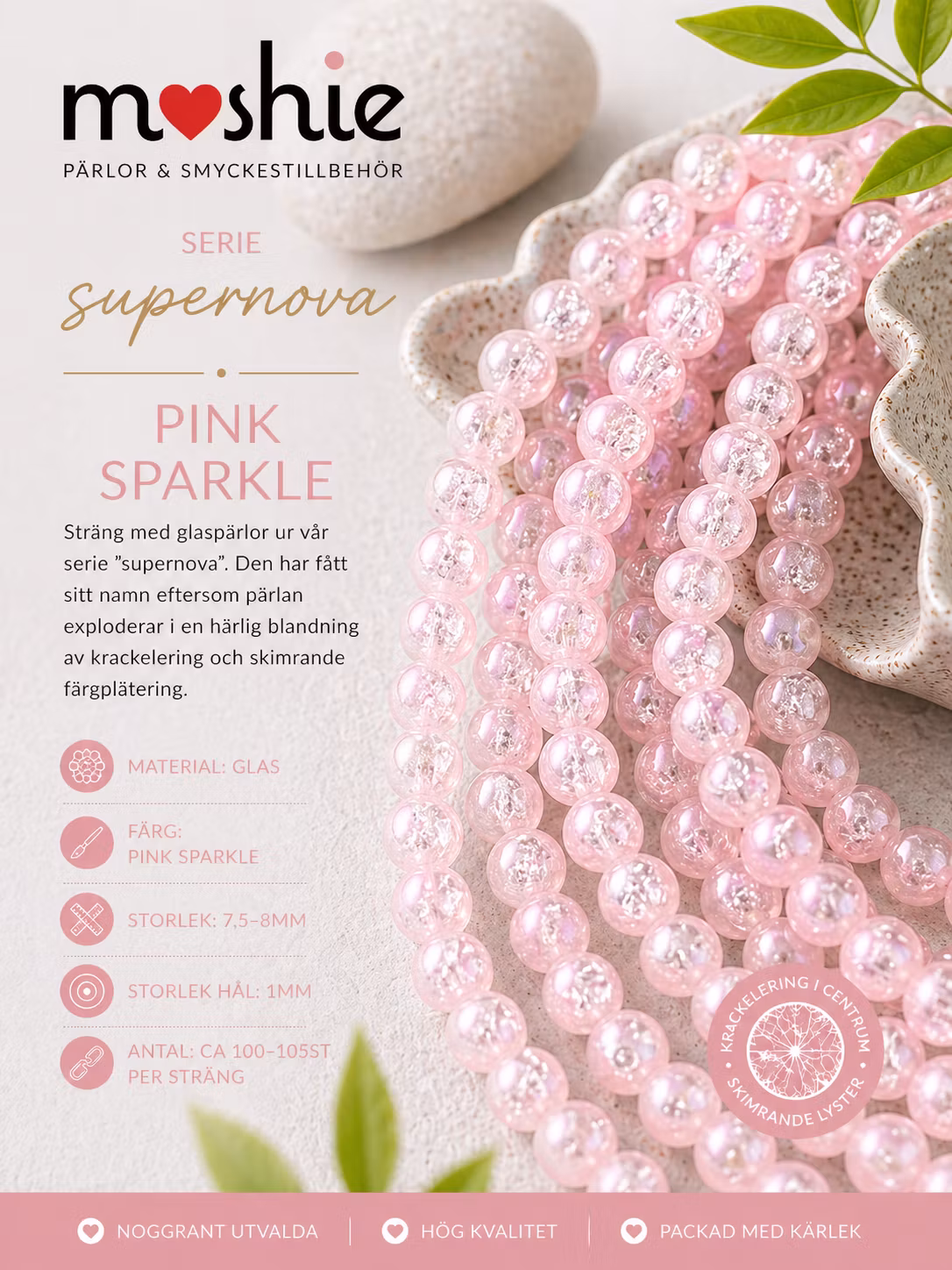 OBS! Bild 1 är skapad av AI för att ge en samlad överblick av all information. Det kan skiljas från verkligheten. Se bild 2 för exakt bild hur pärlan ser ut när vi fotar den hos oss.