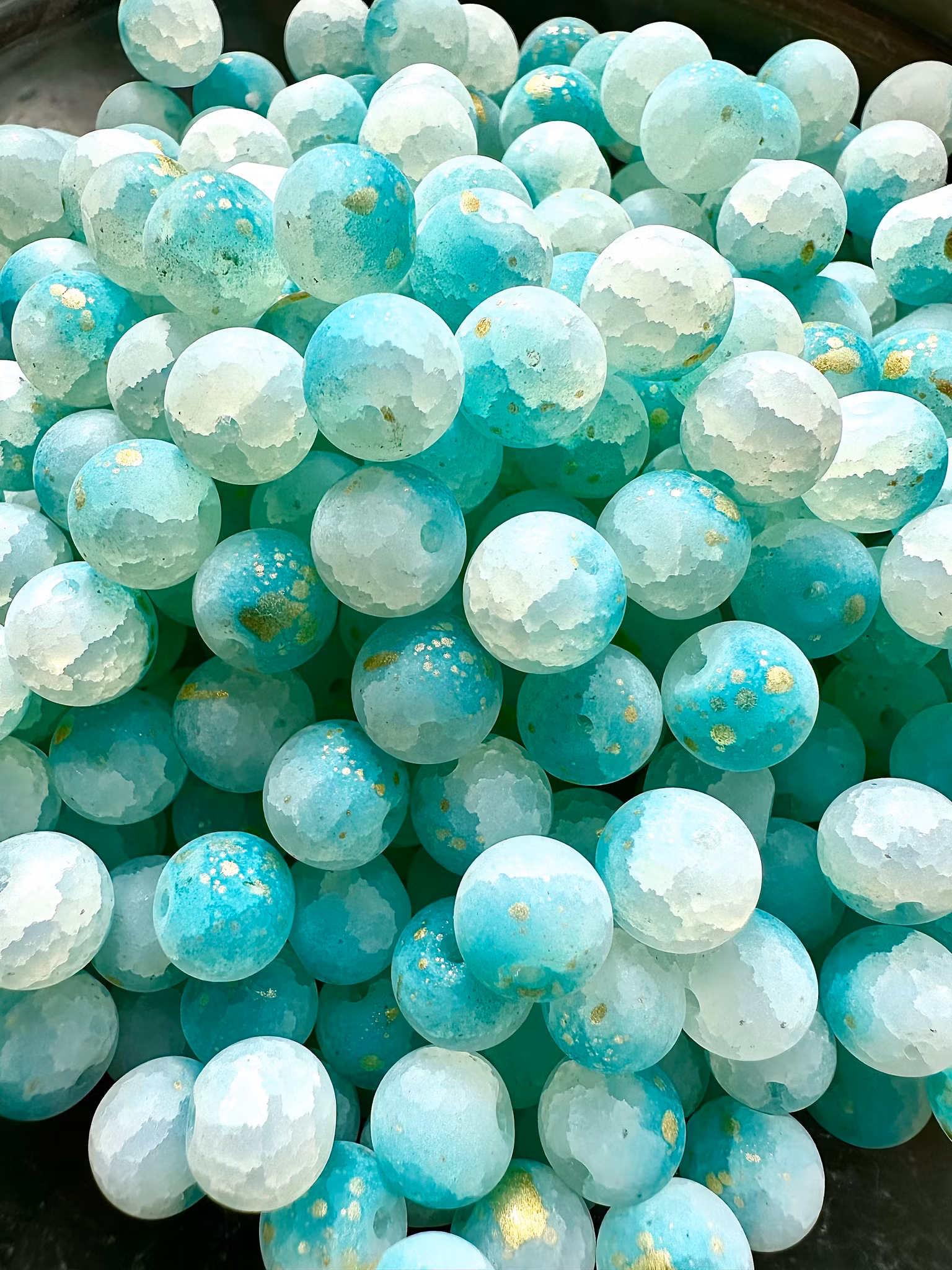Helt magiska glaspärlor. Dovt krackelerade frostade med golddust. Ur moshies serie "universe". Dessa är i färgen aqua. 10mm och hålet är 1,8mm. Njut av dessa magiska pärlor. Du kommer inte bli besviken!