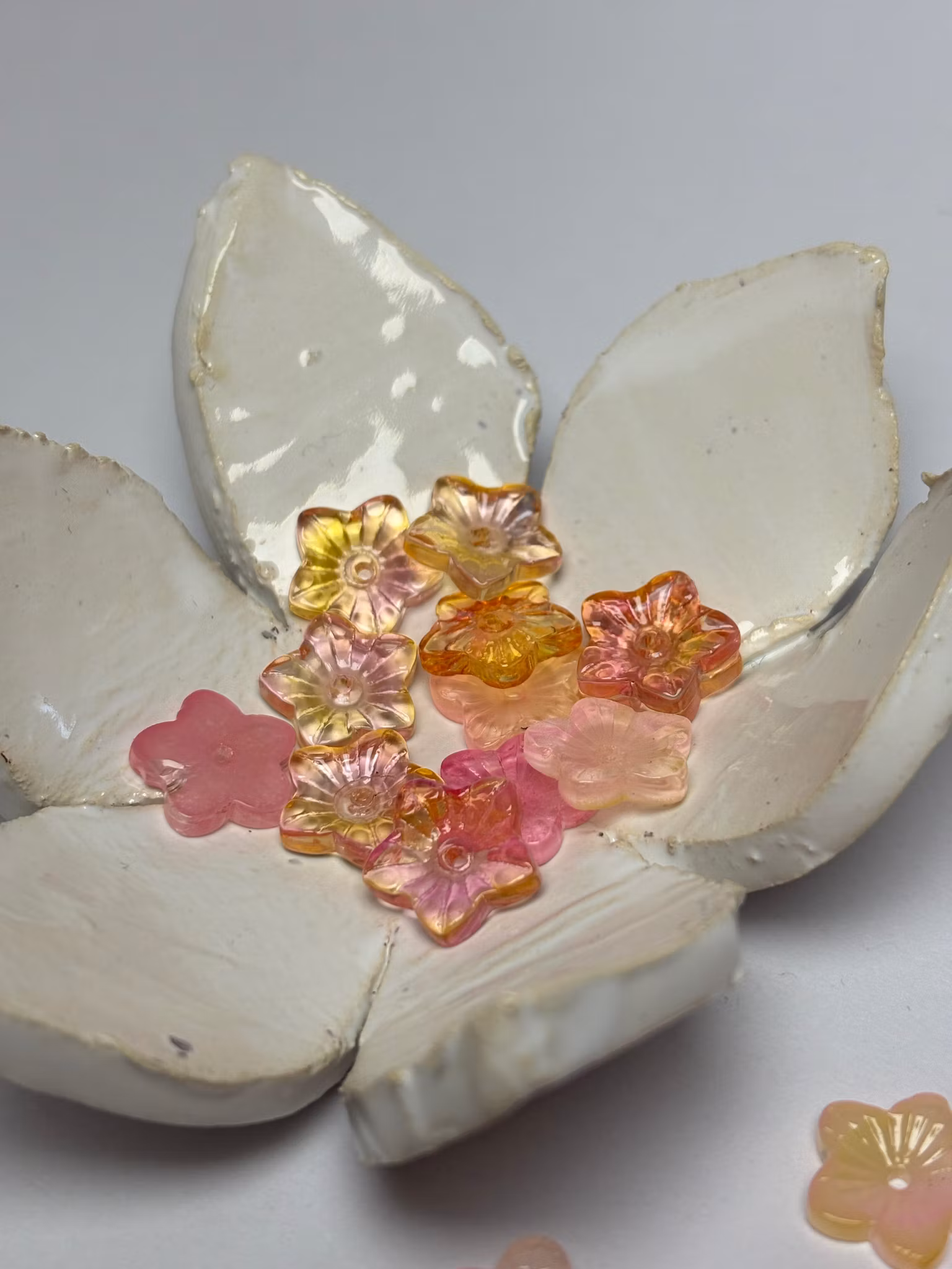 Bedårande glaspärlor i form av blommor i läckra peach/rosa nyanser. Perfekt detalj till alla smycken och pyssel. Hålet går igenom mitten på ovansidan ej som en traditionell pärla som går från sidan, Perfekt för att skapa egna detaljer med kulpinnar.