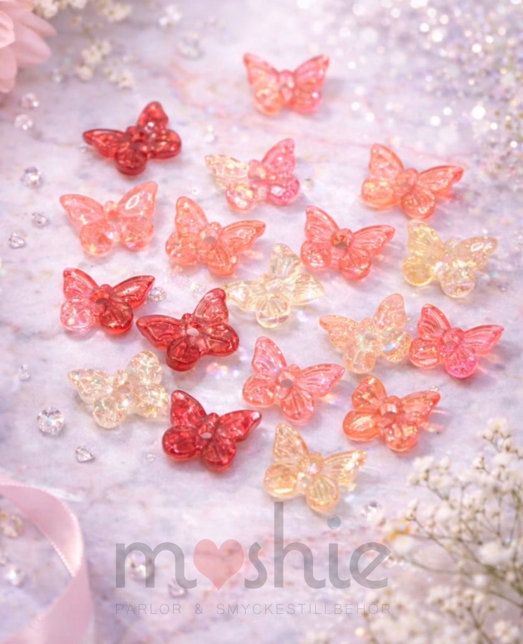 Magiskt skimrande små fjärilar i transparent glas. Perfekta till armband, örhängen, halsband eller som söta detaljer i dina kreativa projekt. Den transparenta finishen gör att färgerna skiftar vackert beroende på ljus och underlag. Insida med golddust och pläterad utsida ger ett elegant och lyxigt uttryck.