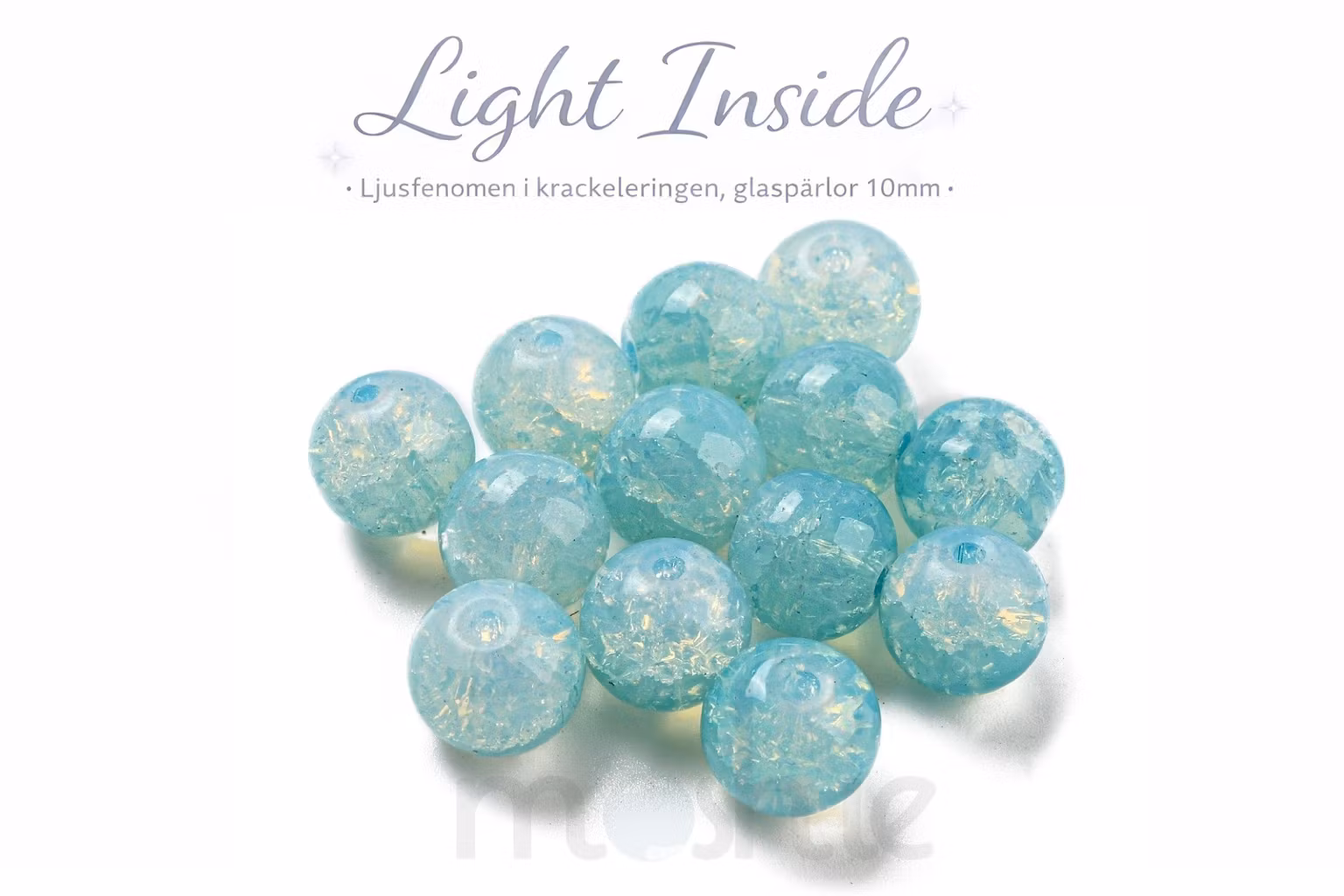 Light Inside är krackelerade glaspärlor med ett unikt ljusfenomen där krackeleringen fångar och sprider ljuset genom pärlan. Detta ger ett mjukt djup och ett levande uttryck i färdiga smycken.