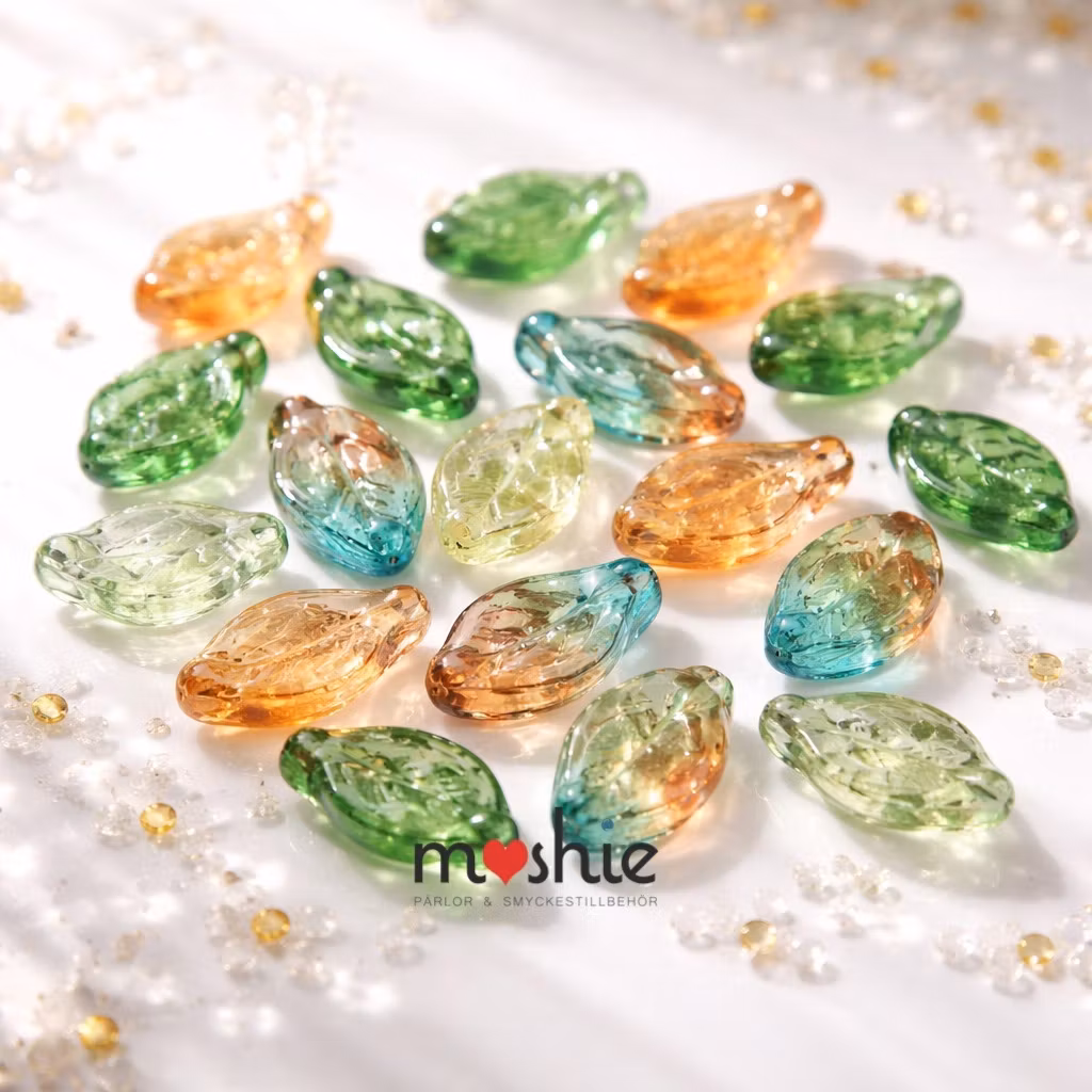 Löv av glas. Pärlor / berlocker av glas. Dessa ger ett naturinspirerat uttryck som passar perfekt i både smycken och kreativa pysselprojekt.