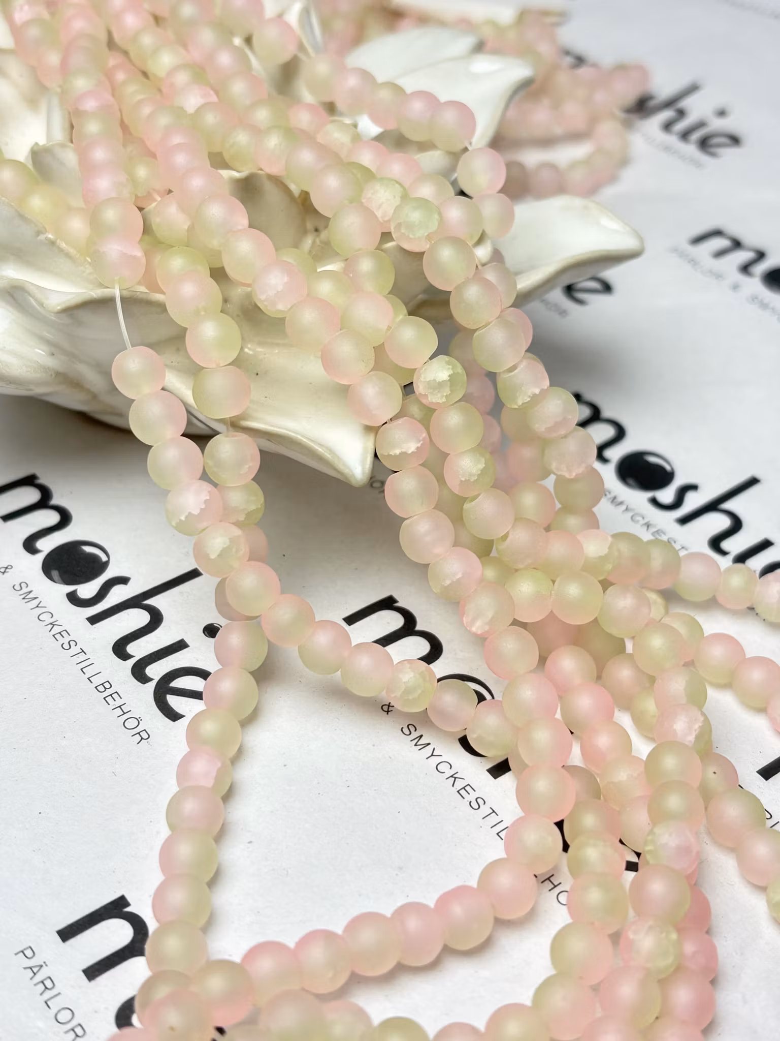 Sträng med glaspärlor ur vår serie "dovt krackelerade" och frostade. Den har fått sitt namn eftersom krackeleringen är dov som söta moln.