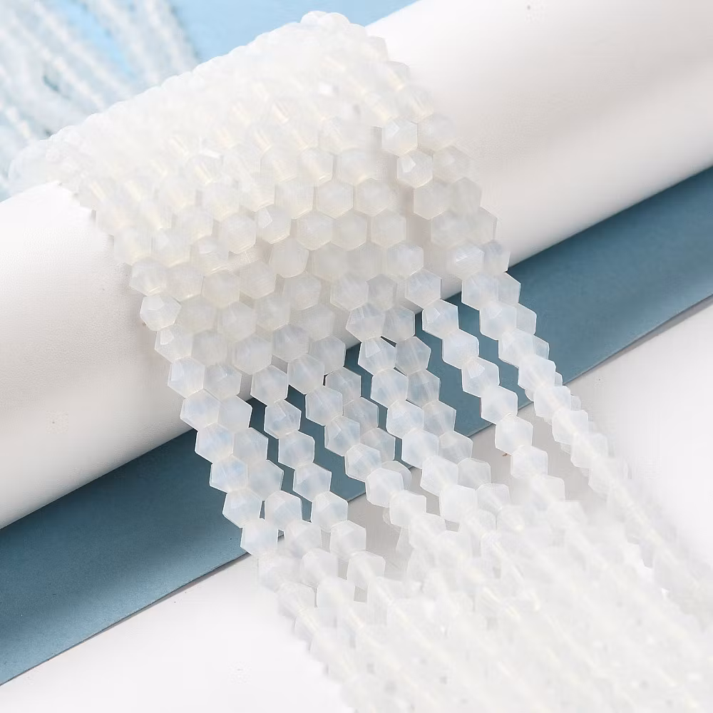 Sträng med biconeslipade imitation av jade. Frostad vit. 4mm och hålet är 1mm. ca85st.