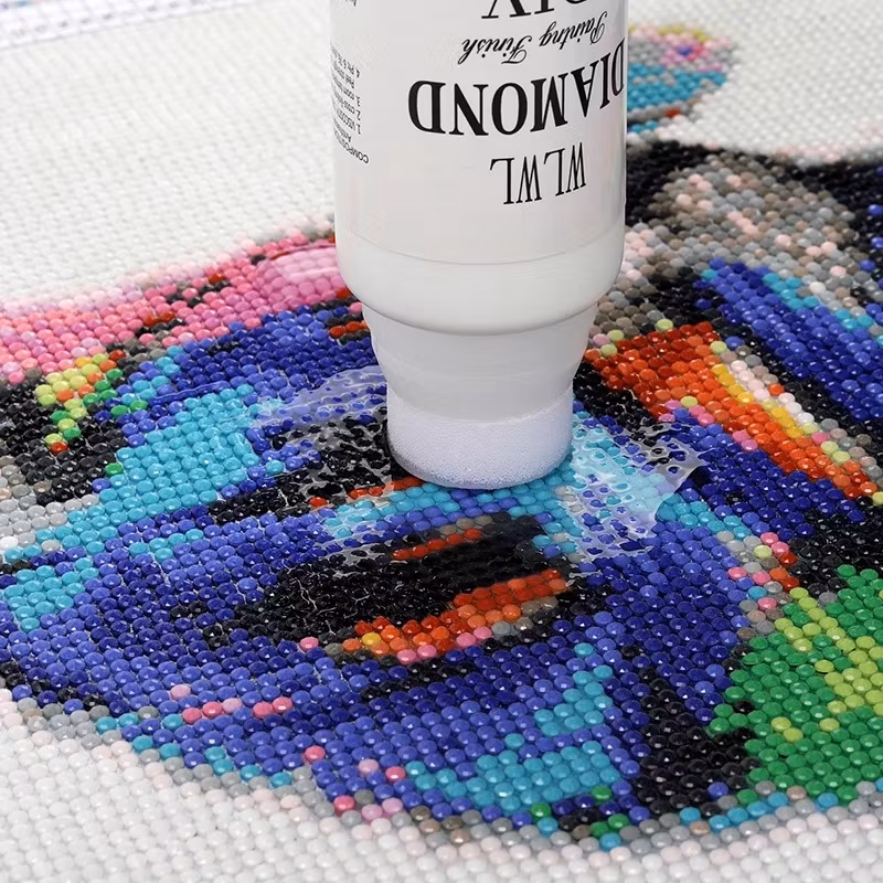 Förseglande lack till din färdiga Diamond painting för att säkerställa att allt sitter fast och håller länge. Använd gärna en roller eller något annat utjämnande först för att säkerställa att alla pärlor sitter korrekt. Kläm sedan ut en jämn mängd och använd med fördel den medföljande svampen och stryk ut jämnt över tavlan. Lacket är först vitt och ser ut som lim så du ser lätt vart du har applicerat. Det torkar efter ca 30 minuter och blir då helt transparent.