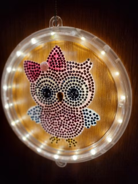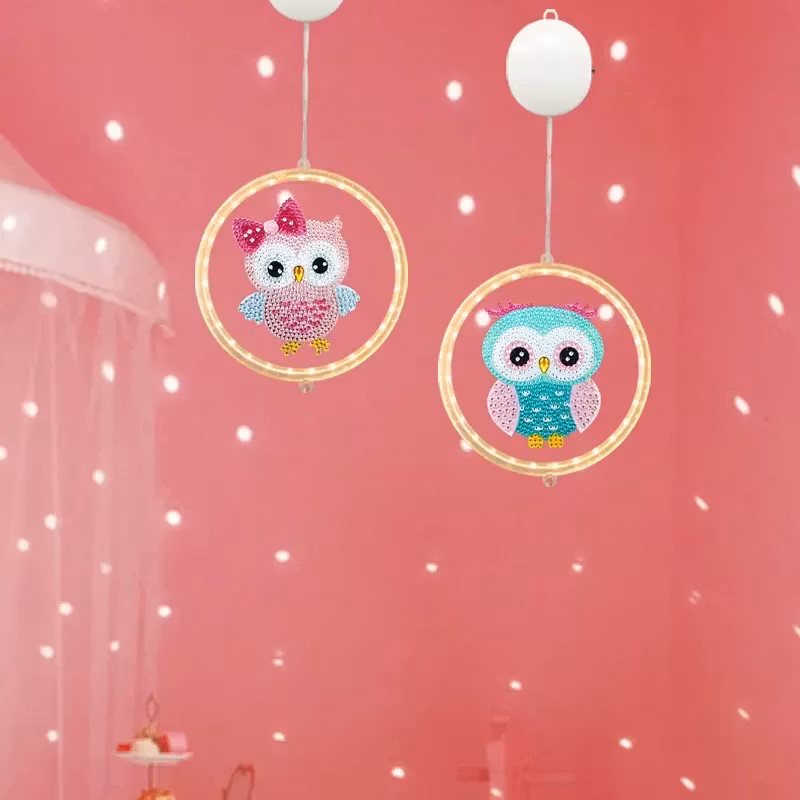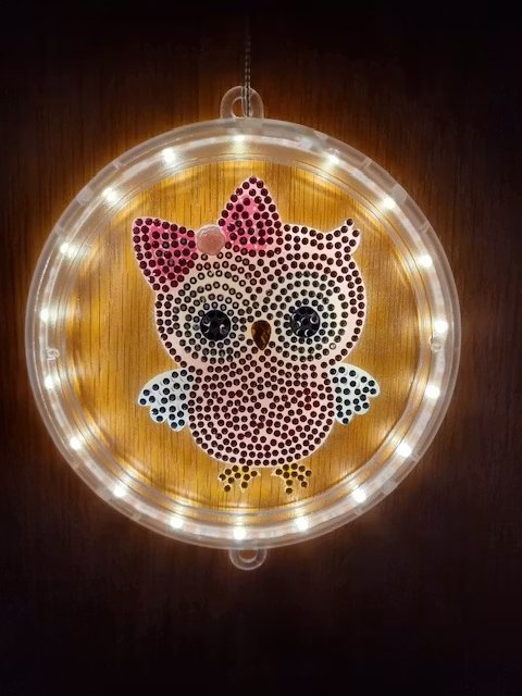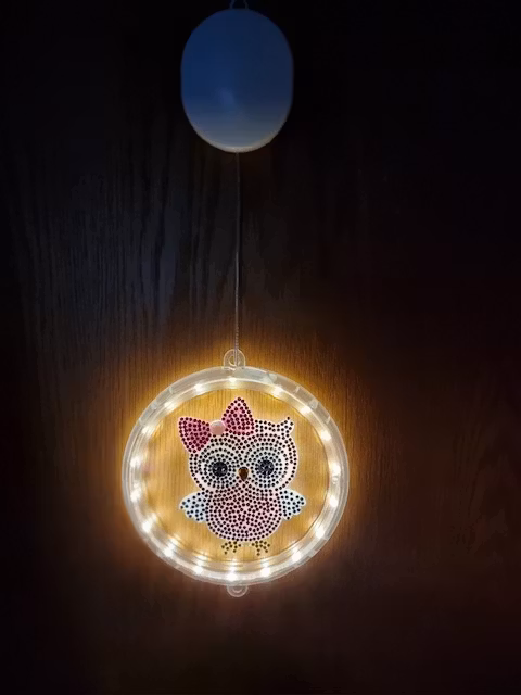 Supergullig lampa med motiv som du Diamond paintar. Allt du behöver för att göra ditt motiv följer med, pärlor, vax, tråg och penna. CE-märkt. 16cm diameter på ringen och sladden är 40cm. Lampan fästes enkelt med medföljande klisterlapp.
