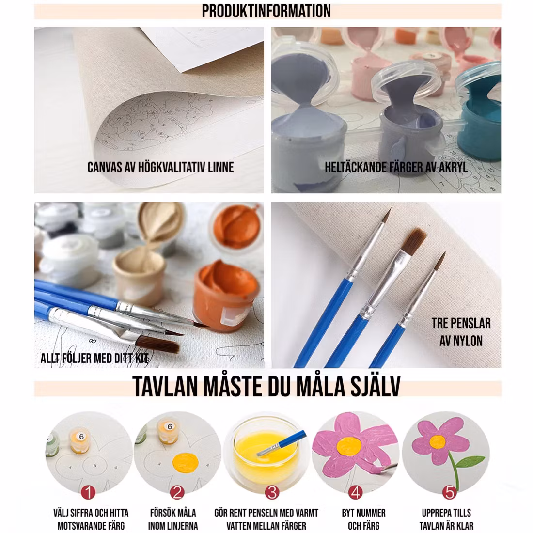 Canvas i bra kvalite av linne. Färdiga nummer som motsvarar en färg som du målar. Du får även med tre penslar i olika storlekar du kan använda till de olika fälten. Duken är spänd över en träram. När tavlan är färdig och torkad kan du hänga upp den på väggen med de medföljande upphängningskittet eller ge bort i present. Mycket uppskattad. Perfekt för dig som vill måla men har svårt för att veta vart du ska börja:)