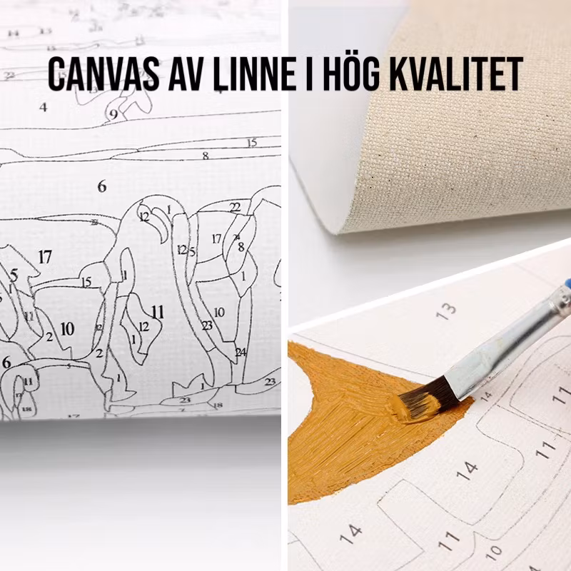 Canvas i bra kvalite av linne. Färdiga nummer som motsvarar en färg som du målar. Du får även med tre penslar i olika storlekar du kan använda till de olika fälten. Duken är spänd över en träram. När tavlan är färdig och torkad kan du hänga upp den på väggen med de medföljande upphängningskittet eller ge bort i present. Mycket uppskattad. Perfekt för dig som vill måla men har svårt för att veta vart du ska börja:)