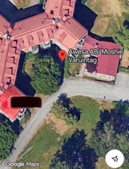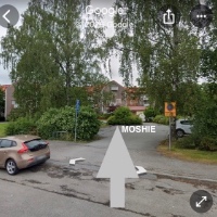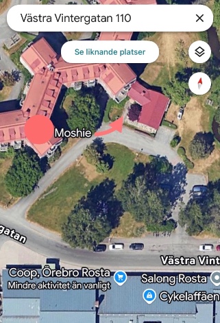 Moshie ligger mitt emot Coops entre, förbi parkeringen och där ser du ett rött metallstaket runt vår trädgård.  Välkommen in