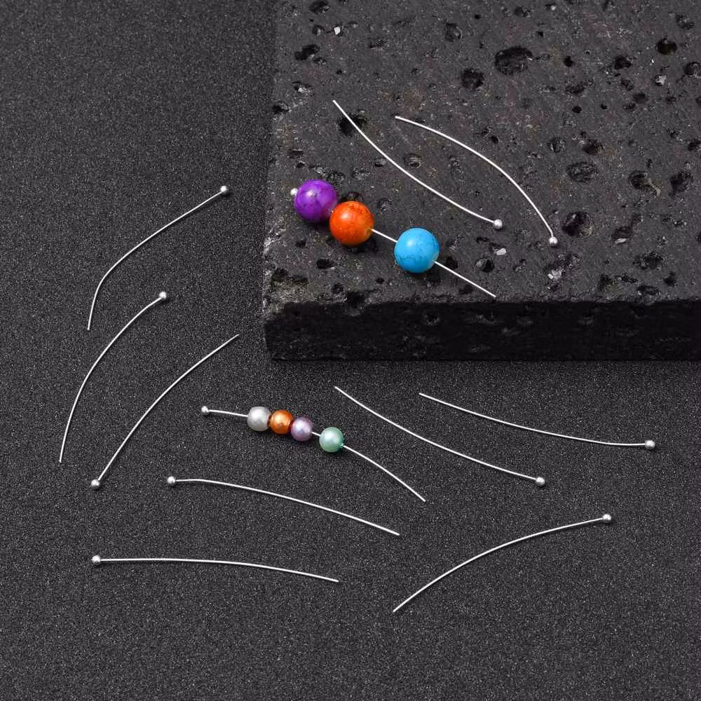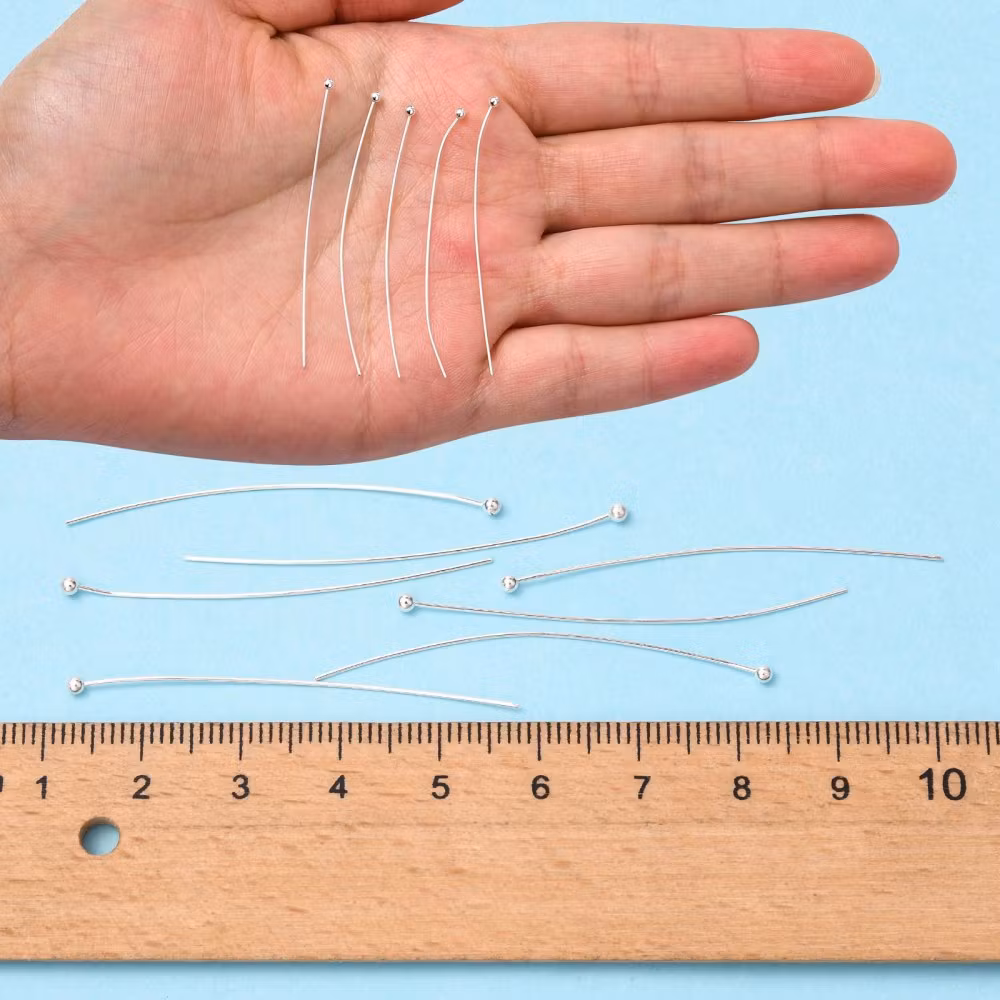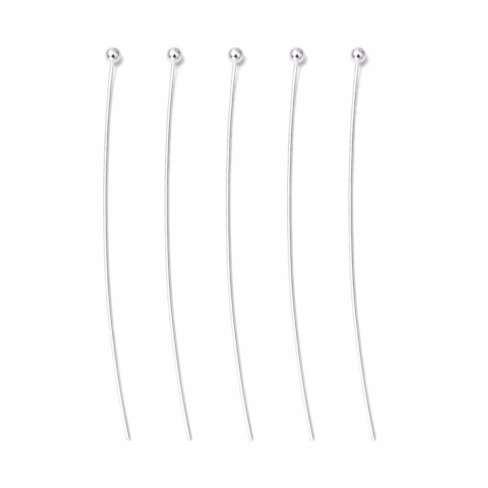 Långa pinnar med kula i silverfärgad mässing av fin kvalite. 45mm långa, 0,5mm tjocka och kulan är 1.5mm.